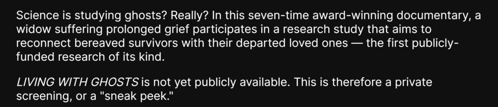 IANDS/ISGO Special Events sponsored an 11-day, free private screening of the 7-time award-winning documentary film, Living with Ghosts, available October 21 – 31, 2021, PLUS featured this free Live Producers Panel with audience Q&A, held 6 pm PDT (9 pm EDT) on Saturday, October 30, 2021.